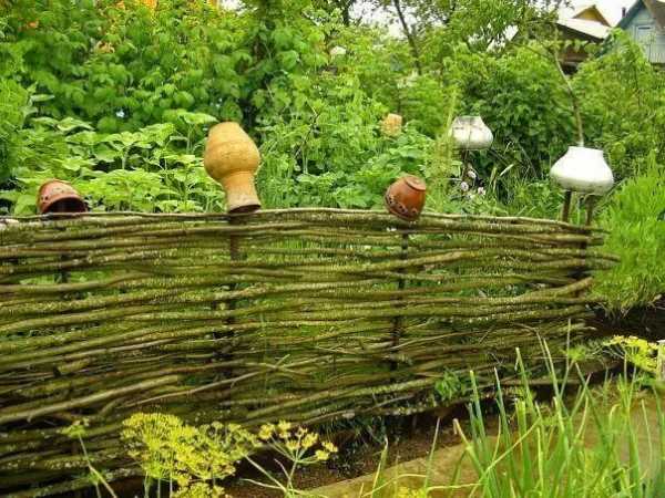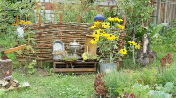 Обязательный элемент декора в кантри-стиле — плетеный деревенский забор. Обычно его используют в качестве элемента оформления возле дома, а также для отделения различных зон участка друг от друга. Колорит забору придают глиняные кувшины и посаженные рядом мальвы и подсолнухи.