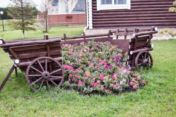Помните! Колёса и сёдла, как декоративные детали, пришли в деревенский ландшафт из Америки, а фальш-мельницы – из голландского садового искусства. Зато телега, «гружённая» полевыми цветами, будет весьма по-русски!