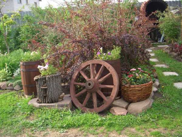 Распространённые атрибуты кантри-стилистики – телеги, повозки и тачки. Прямо в них высаживают цветы; колёса и дышла водружают посредине клумб, делая их центром композиций.