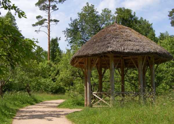 Второй вариант зоны отдыха – открытая беседка. Делать ее можно из деревянного сруба. В качестве ограждения можно использовать невысокий частокол и садовый мостик через искусственный водоем. Именно присутствие воды требует определенной открытости данного сооружения. При этом оформление будет уже другим, отличным от предыдущего. Вместо вьющихся растений в таком случае отлично будут вписываться розы или пушистые кусты.