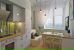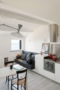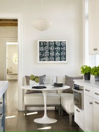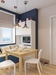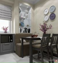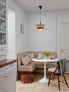 На кухне останутся шкафы и большая часть бытовых приборов, а на территорию комнаты будет вынесена обеденная зона. Хозяевам уже не придется усиленно экономить пространство, а значит, здесь можно установить полноценный обеденный уголок.