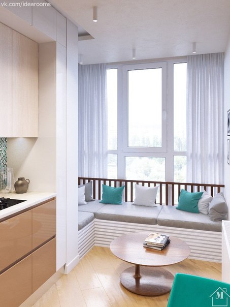 - Балкон или лоджия. В этом случае на территорию бывшего балкона целесообразно вынести рабочую кухонную зону и часть системы хранения.