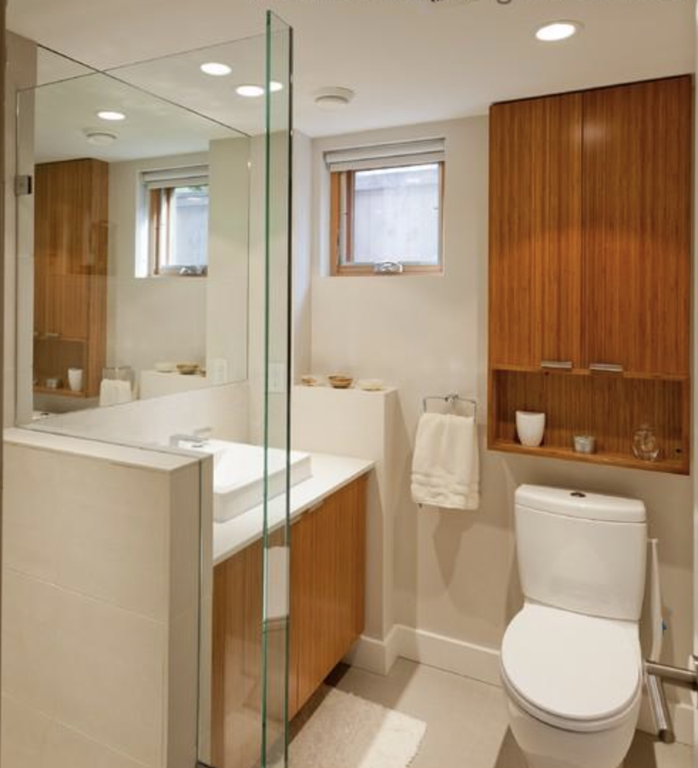 Популярный тренд и главное средство экономии места – стеклянная душевая перегородка. Вы можете оставить отверстие для «двери» вместо того, чтобы иметь настоящую дверь, которая распахивается или скользит.