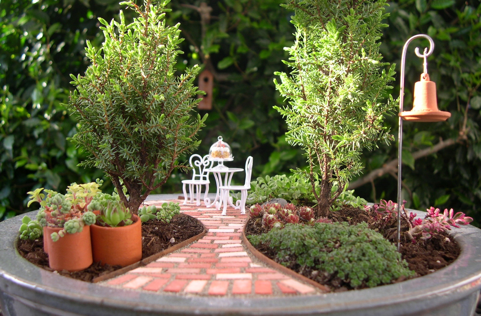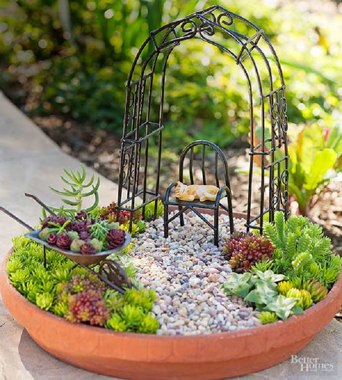 Сказочные сады представляют собой миниатюрные композиции с маленькими домиками, крошечными растениями, деревьями и тропинками.