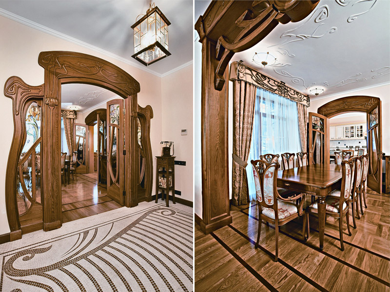 - На полу паркет с характерными для стиля ветвистыми линиями и асимметричными переплетениями.