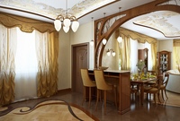 - Преобладает цветовая гамма белая, золотистая, древесная. Вертикальные поверхности можно оштукатурить – золотистая штукатурка с росписью более темного цвета. Потолок белый, но по периметру нанесена золотистая роспись.