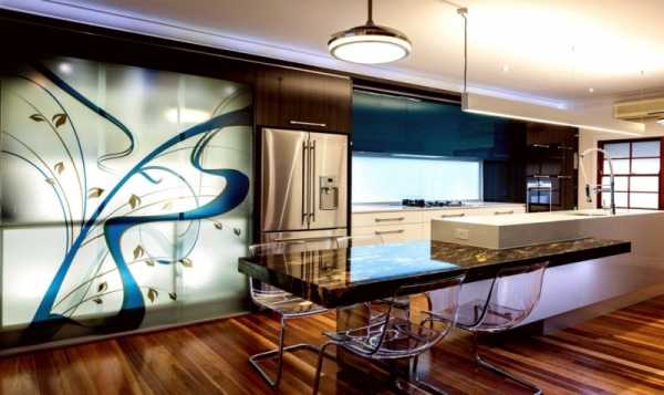 Необычный интерьер кухни выражается в декоративной отделке и обеденной зоне. Сочетайте яркие и сочные цвета отделочных материалов, которые улучшают настроение, вызывают положительные эмоции и пробуждают аппетит. Отдайте предпочтение столу и стульям нестандартной формы, постелите на пол ковер пэчворк.