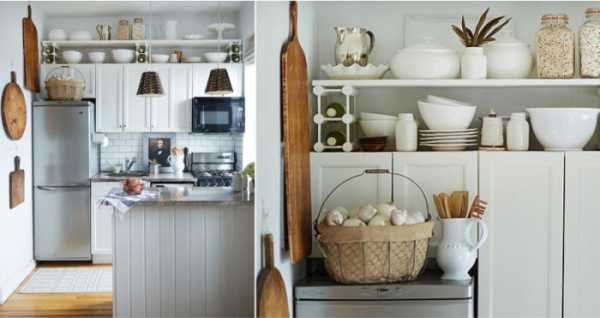 Сегодня замена верхних шкафов на открытые полки является одним из модных трендов в дизайне. Но это не всегда практично: требует частную уборку от пыли, становится меньше мест хранения. Зато это значительно облегчит обстановку маленькой кухни. Идея на любителя и имеет место быть.