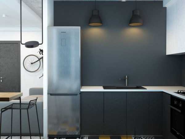 Помещение вмещает всю необходимую технику, но не остается места для столовой. Ее организуют в гостиной.- Без верхних шкафов.