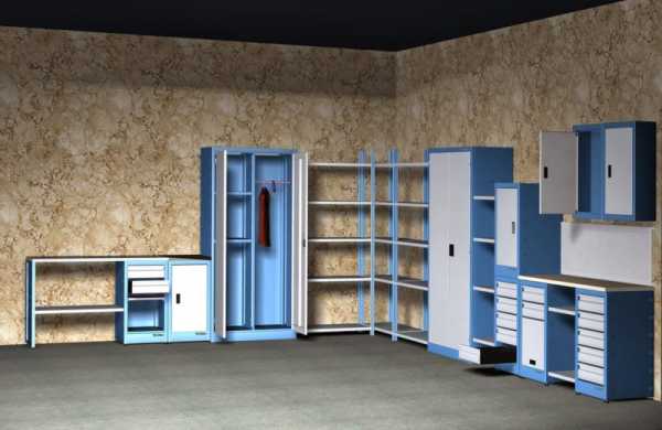 Для инструментов стоит приобрести или изготовить специальные полки, оснащенные отверстиями для отверток, перфораторов и пр. Некоторых может привлечь вариант с закрытыми полками, собранными из ненужных подвесных шкафов.