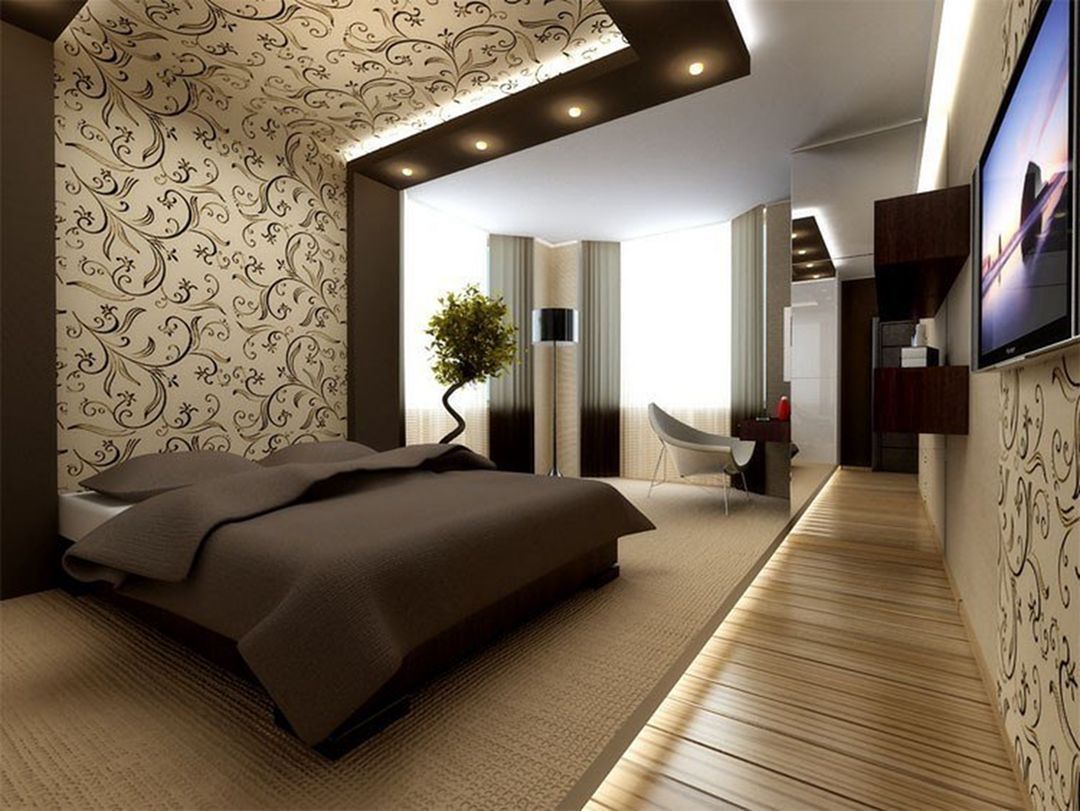 Пол в современном стиле спальни укладывают материалом из натурального дерева, например паркетом. Заменой дорогому настилу служит бюджетный ламинат, имитирующий различные породы дерева. Подойдет для спальни и ковровое покрытие.