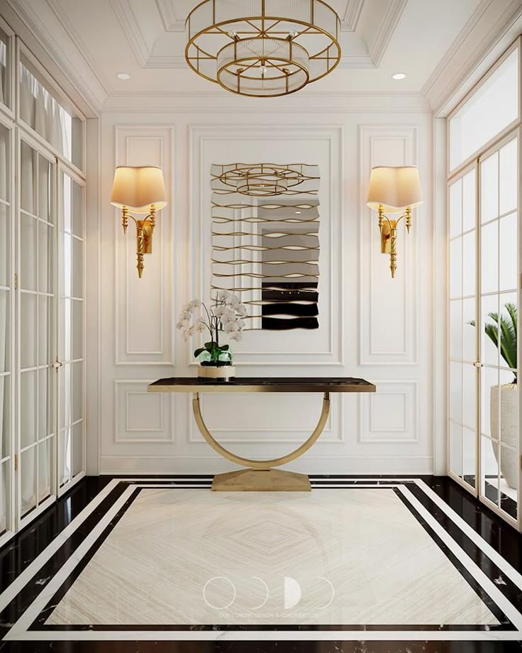 Здесь нам не хватает мрамора. Если вы чувствуете то же самое, вы можете подумать о добавлении классической мраморной напольной плитки в свой список идей для прихожей.