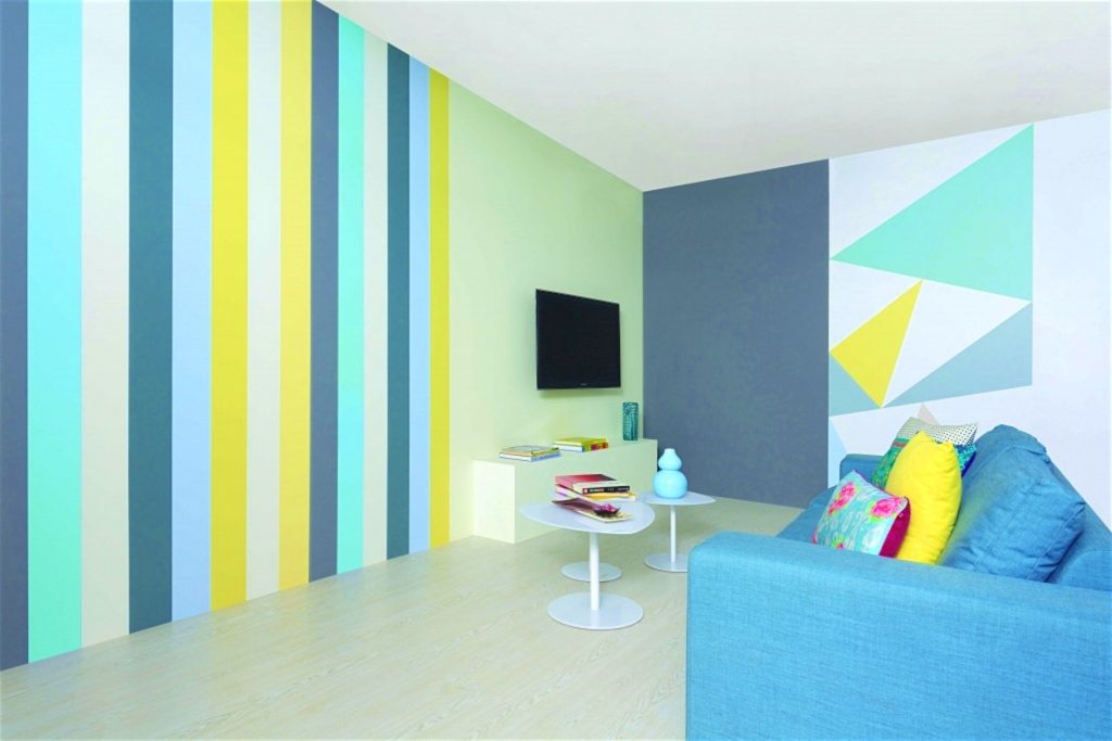 Достаточно использовать два-три тона и стена легко превращается в полосатую. Нужно сказать, что процесс этот довольно трудоемкий, но результат стоит потраченного времени. Проще всего делать широкую полосу – в этом случае потребуется меньше работы со скотчем, да и результат будет выглядеть аккуратнее. Широкая полоса выглядит мягче, чем узкая.