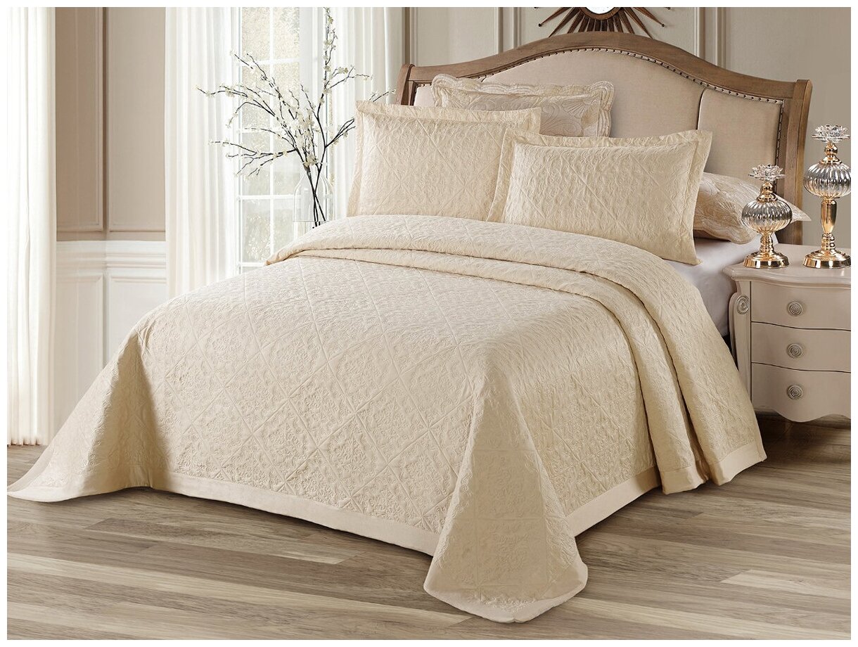 - красивое современное покрывало бежевого цвета на 1,5-спальную кровать, украшенное широким кантом;