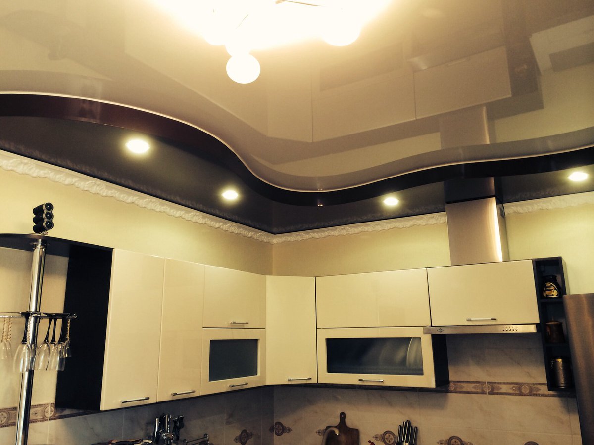Если в кухне необходимо зонирование, то применяют многоуровневый потолок. Это конструкции дышат, практичны, долговечны, экологичны и недороги.