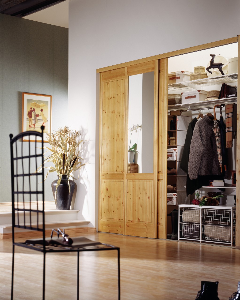 - Гардеробные системы и полки, установленные в нишу прихожей и оборудованные раздвижными дверями.