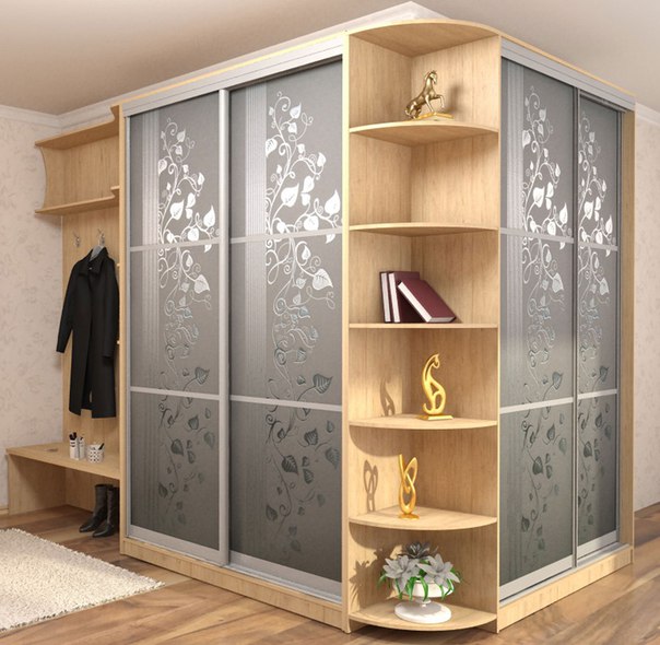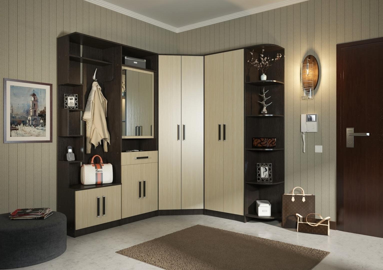 Угловое расположение не допускает наличие дополнительных полок или тумб, особенно если помещение небольшое. Если коридор узкий, то размещать шкаф в углу нет смысла, покупка подобного изделия допустима, только если передняя имеет квадратную или прямоугольную форму.