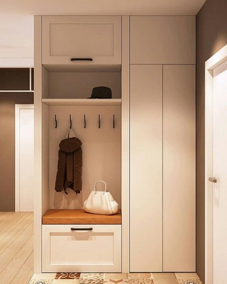 - Для маленькой прихожей, следует выбирать компактные конструкции с купейными или складными дверями-гармошка, которые не будут загромождать помещение и скрадывать площадь.