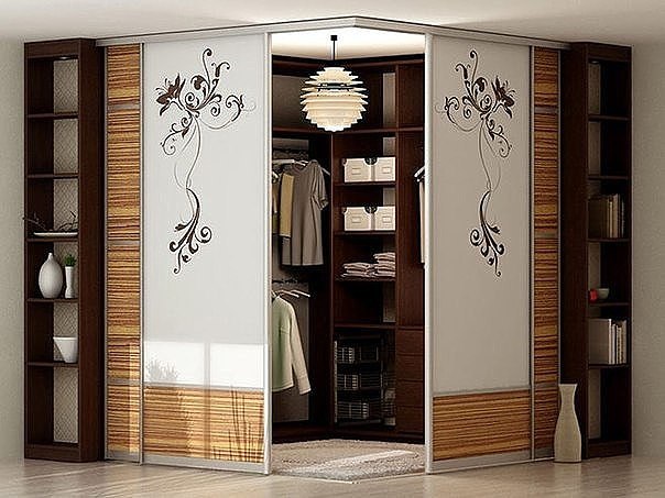 Они могут находиться в углу между двумя дверьми, будучи весьма компактными конструкциями. Угол в таком шкафу сделан по прямой линии, в отличие от других более габаритных моделей, которые выполнены в изогнутой форме. Отсек с раздвижными дверьми часто бывает выпуклой формы, что делает модель более габаритной, чем ее прямолинейный аналог.