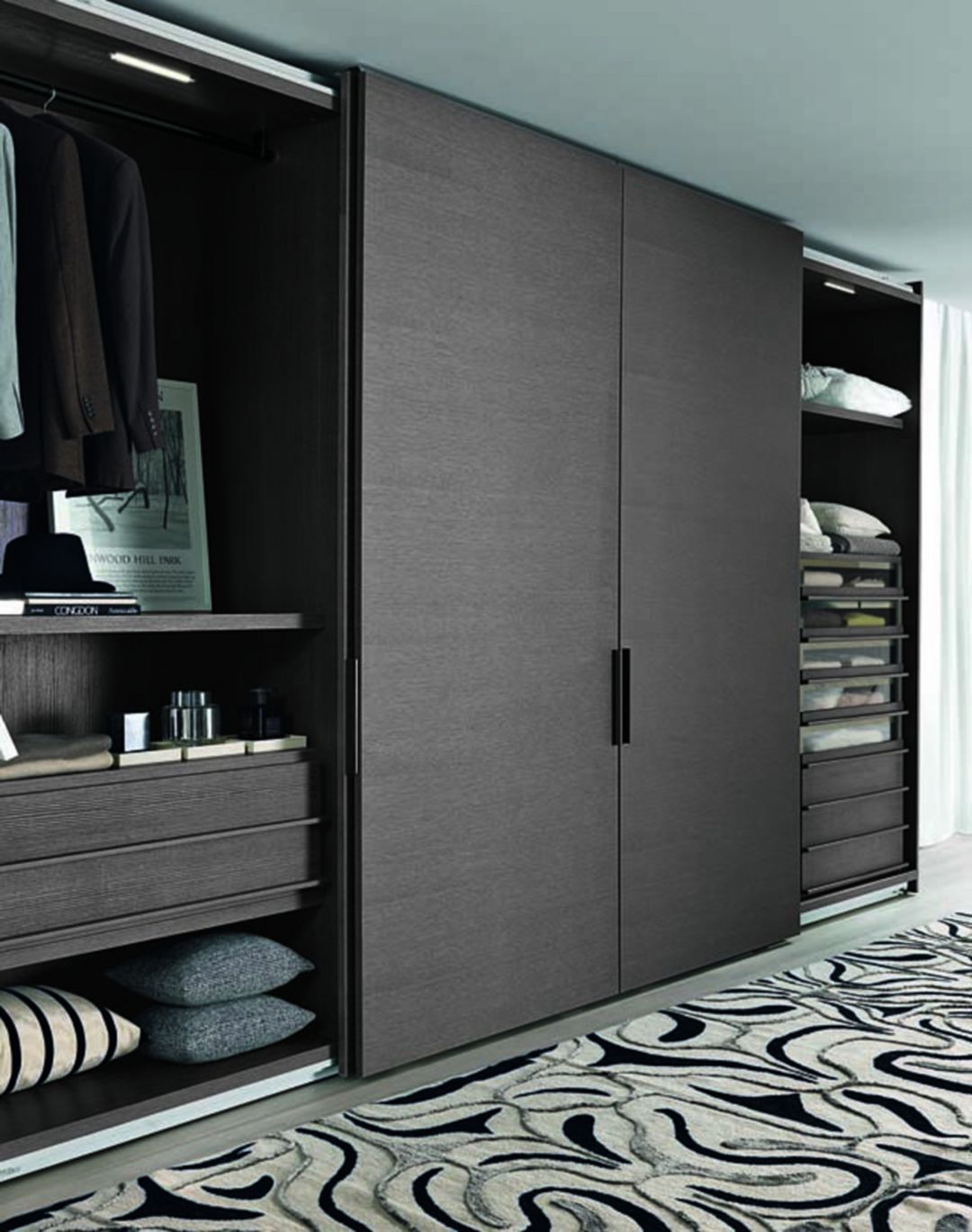 Фасады шкафа могут скользить или открываться традиционно. Стоит обратить внимание на раздвижные дверцы конструкции. Тонкие алюминиевые профили могут быть заполнены шпонированными панелями, ламинатами, стеклом и зеркалами. Существуют также современные, непрофильные мобильные системы. Обычно шкаф-купе становится изюминкой интерьера, выделяясь на общем фоне ярким цветом или принтом.
