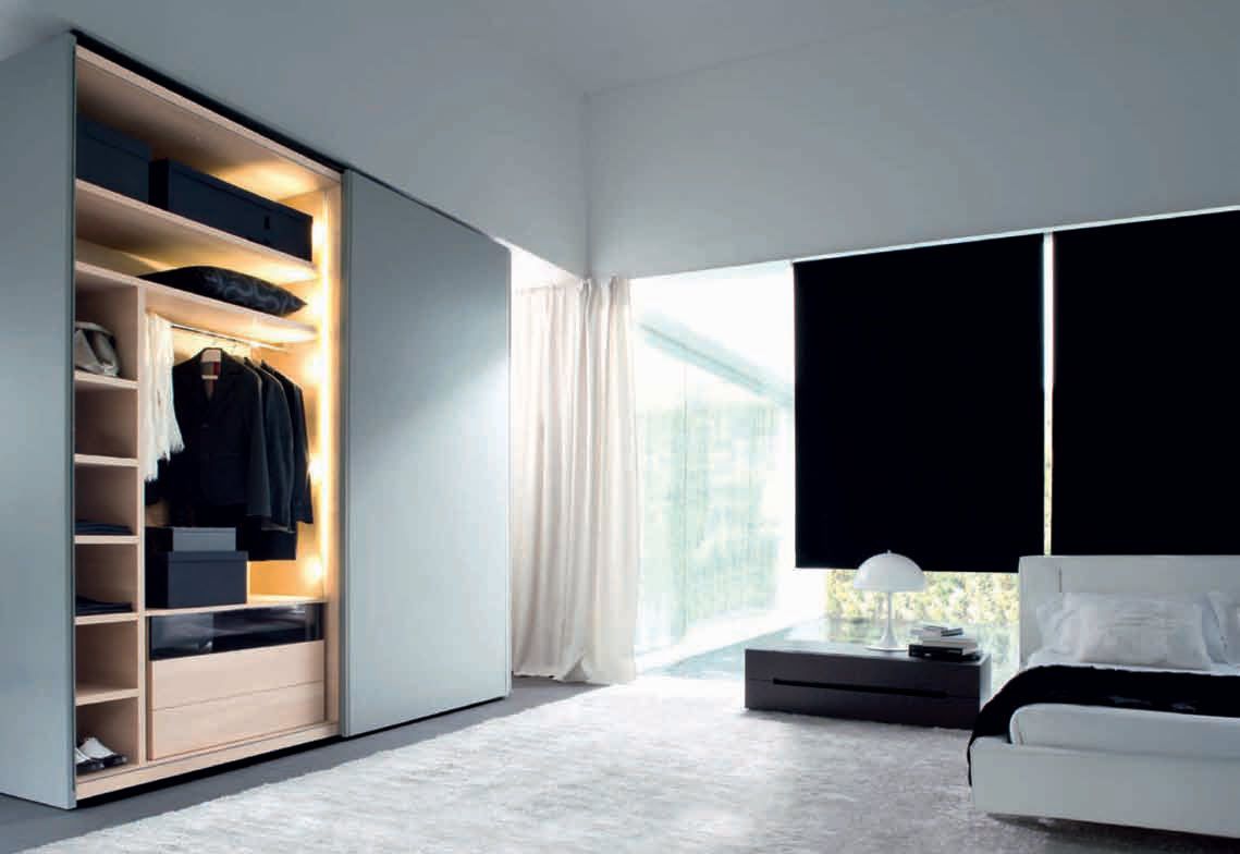 Изделия с раздвижными дверями более компактные, чем корпусные, а современные гарнитуры помогают удобно разместить их в интерьере. Помимо стандартного расположения у стены, они могут служить в качестве перегородки для оптимального зонирования пространства.
