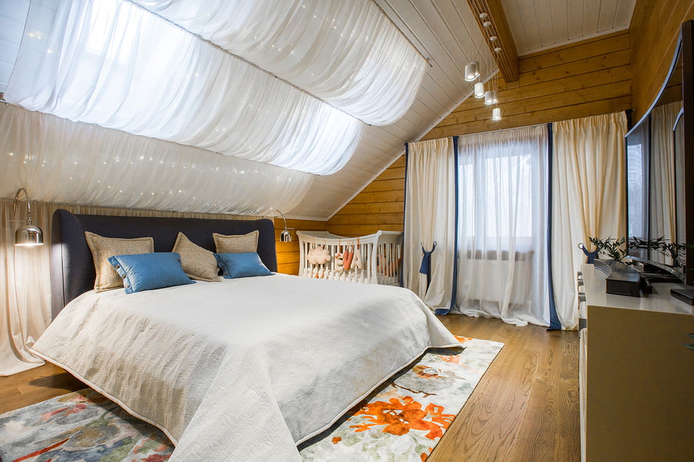 - Для мансарды в деревянном доме подойдут простые шторы с фиксацией свободного края с помощью подхватов.