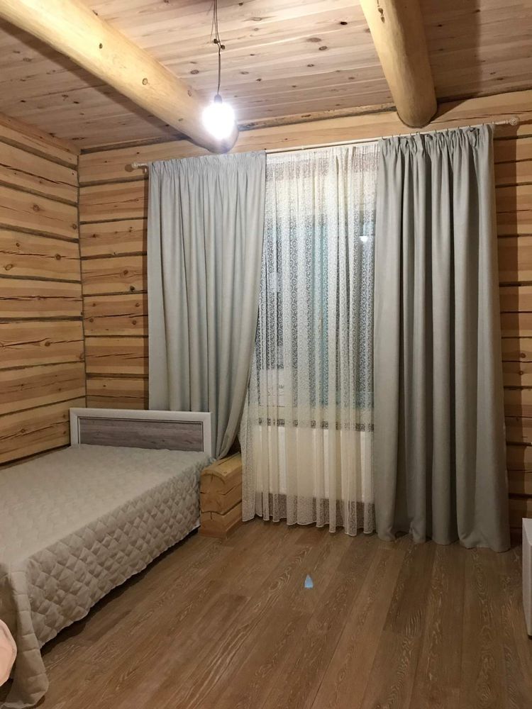 Деревянный дом за городом – это приятное место для горожанина, куда хочется возвращаться и проводить все выходные. Деревянные стены и натуральные шторы передают ощущение природы и свежести леса. Дизайн дома настраивает на расслабление, не последнюю роль играет и декор оконного проема. Органично будет сочетаться цвет штор с текстилем или обивкой мебели. Для декорирования можно взять бахрому, кисти и бантики, подхваты.