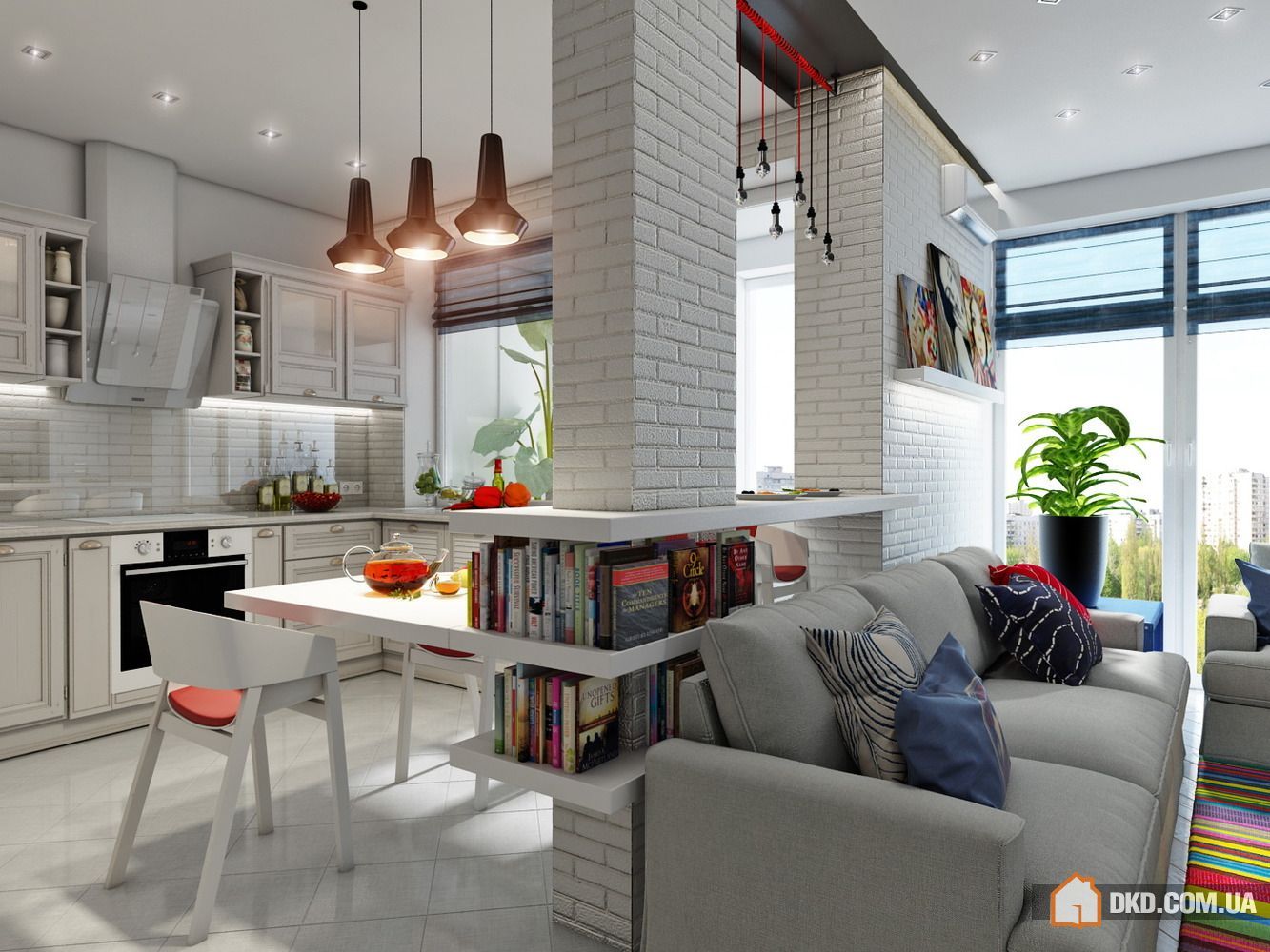 Можно визуально отделить зону кухни вот такой неширокой перегородкой.