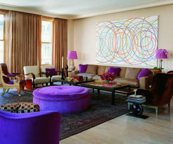Фиолетовый. Красочный сиреневый поможет избавиться от ощущения груза повседневности. Выбирайте оттенки фиолетового для создания оригинального пространства гостиной.