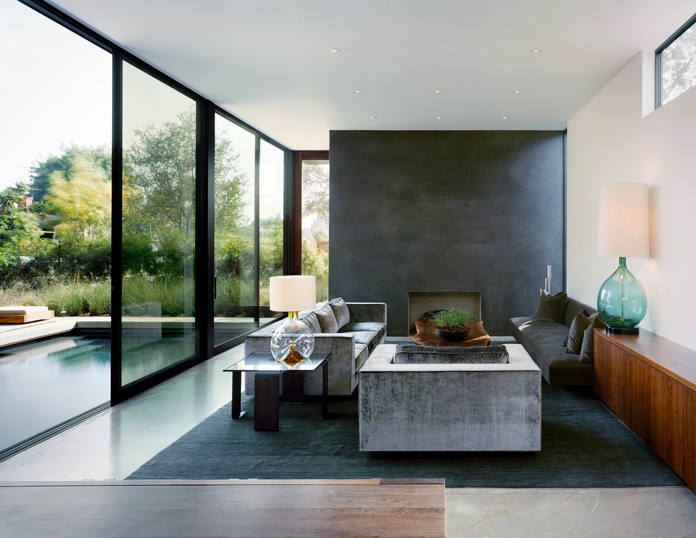 В проекте ниже палитра материалов ограничена в основном бетоном и стеклом. Тем не менее, плиточный бетон придает текстуру и интерес к минималистичному дизайну интерьера.