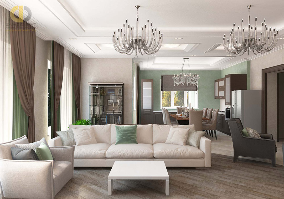 Легкие классические мотивы в оформлении загородного дома перекликаются с элементами ар деко, а также штрихами некоторых других направлений дизайна.
