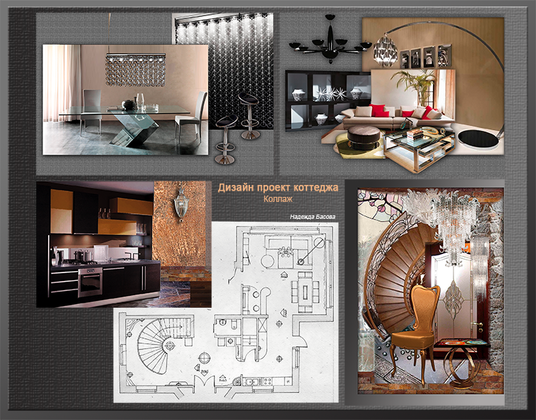Такой применяемый дизайнером инструмент как интерьерный коллаж помогает подобрать подходящее стилистическое и колористическое звучание пространства, наглядно демонстрирует сочетаемость форм, цветов и материалов. Техника коллажей, в отличие от 3D-визуализации, не подразумевает глубокой проработки и фотореалистичности будущего интерьера.