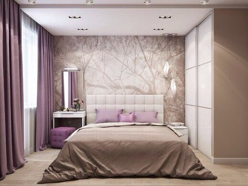 Следует учитывать стилистику интерьера и расположение спальни. Для слабоосвещенных пространств лучше выбирать более мягкие и теплые тона. К ним можно отнести классический бежевый, «сладкий» розовый и нежный персиковый цвета. Ни в коем случае не оформляйте темное помещение мрачными красками, так как это может сформировать депрессивную атмосферу в спальной комнате.