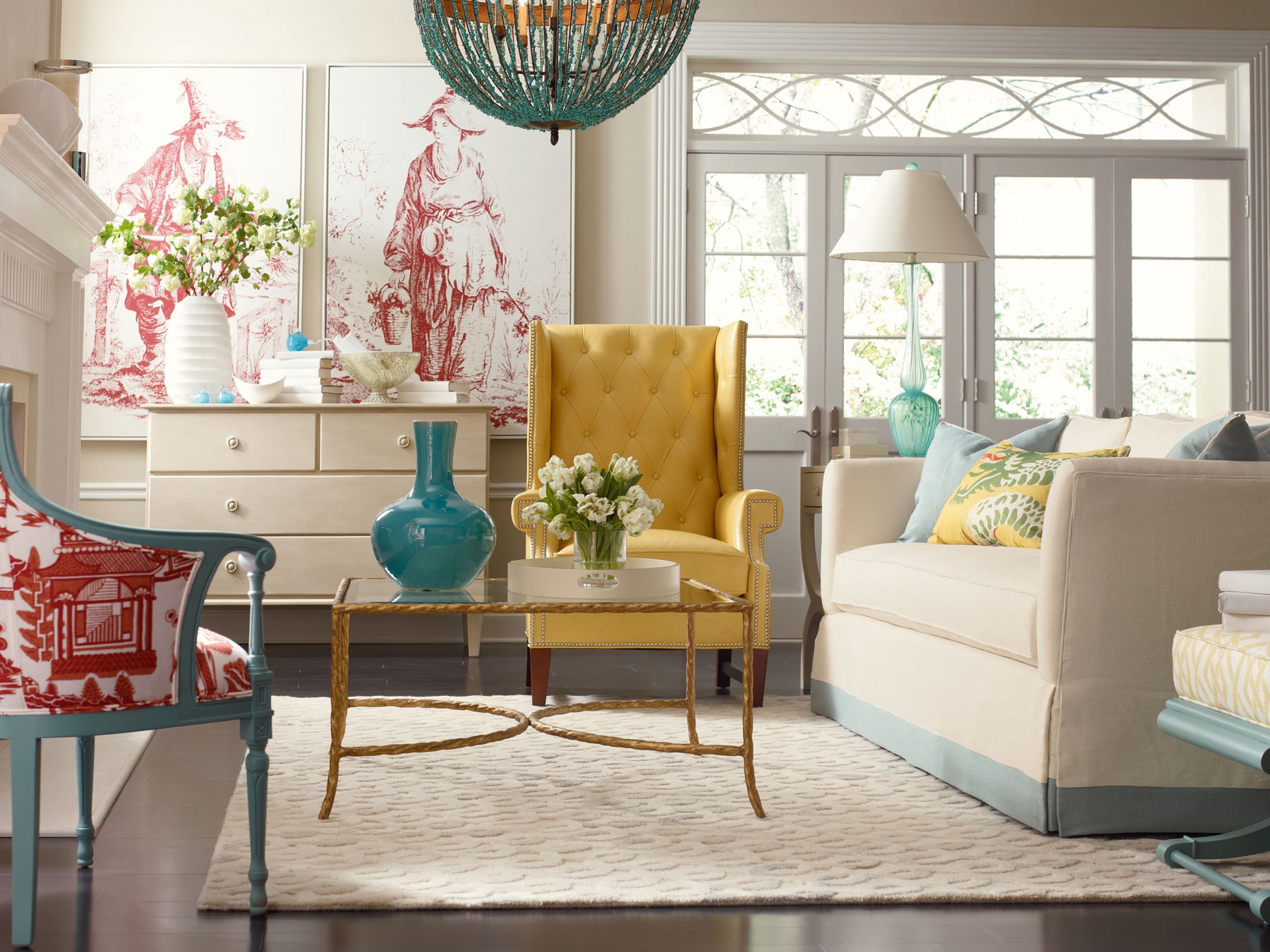 Cтены окрашиваются в ослепительно-желтый, ярко красный или мягкий кремовый тона. Полы из дерева застилают толстыми и уютными шерстяными коврами. Важный атрибут английской гостиной — мягкий шерстяной плед с клетчатым узором и подставка для ног. Жилье украшает массивная, но при этом изящная полированная мебель. В Англии розы активно используют в текстиле: на гардинах, мебельной обивке. Сочетание тканей в интерьере английских гостиных сочетают строгую клетку рядом с романтичным цветным узором.