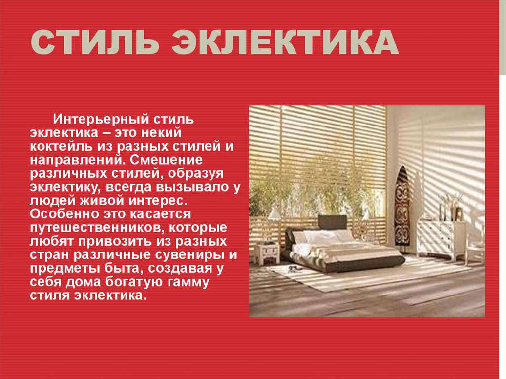 Эклектика представляет собой сочетание нескольких направлений в едином интерьере. Примечательным является то, что такой стиль можно разглядеть практически в каждой исторической группе. В качестве примера можно привести: бидермайер, контемпорари, поп-арт.