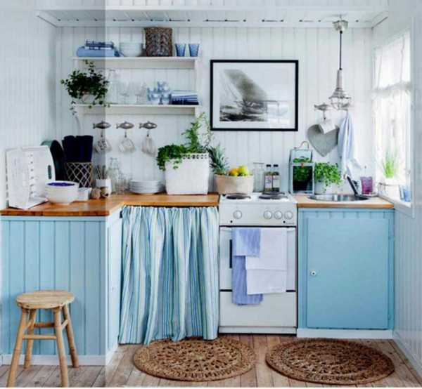 Оформить кухню следует в светлых тонах. Белый, песочный, салатовый, бледно-голубой оттенок сделают помещение более просторным и воздушным. От массивных гардин и карнизов необходимо отказаться, заменив их легкими невесомыми занавесками. Хорошее освещение поможет зрительно увеличить габариты комнаты.