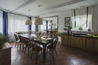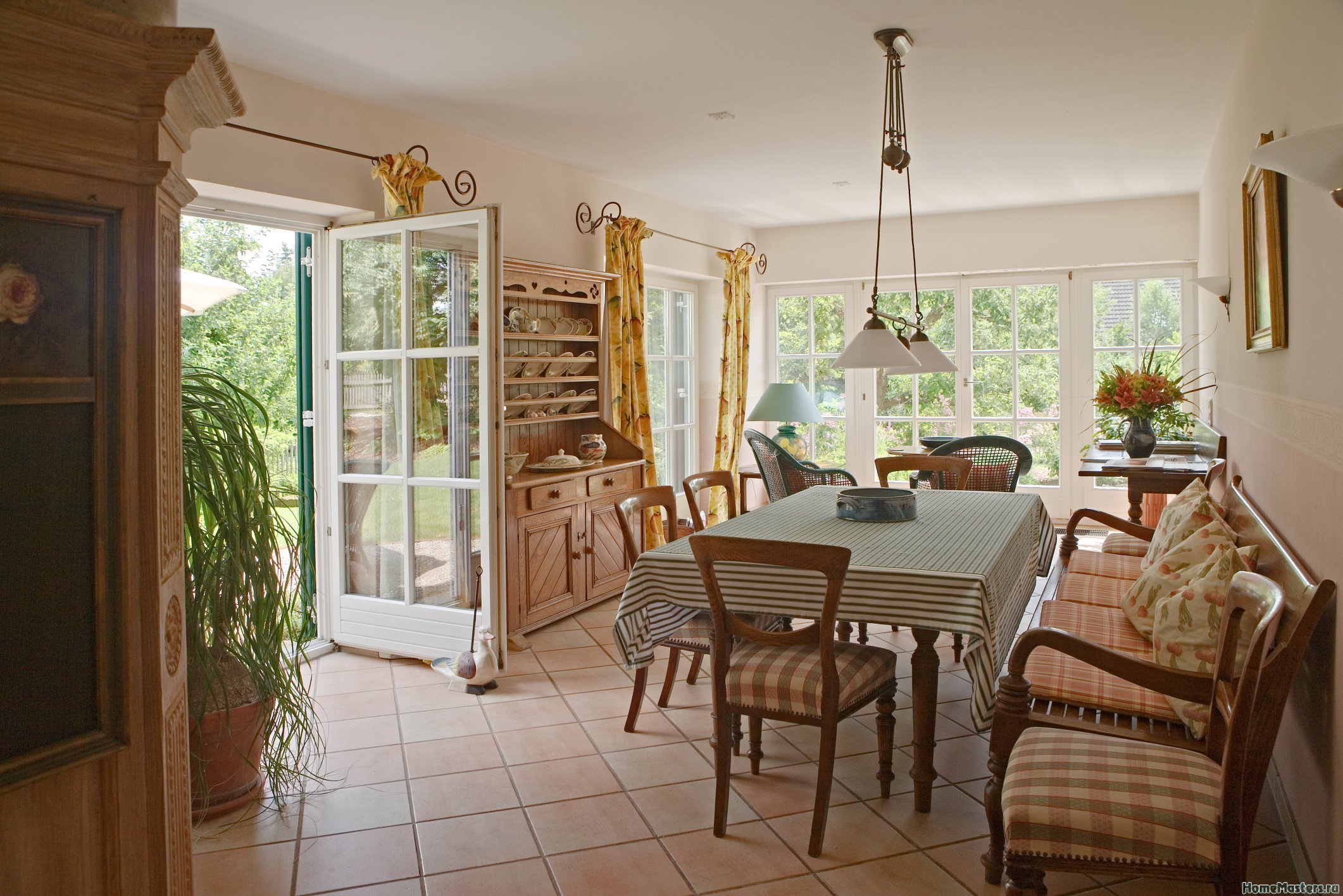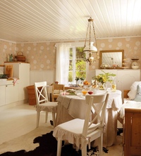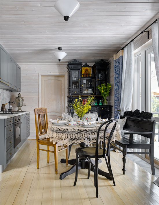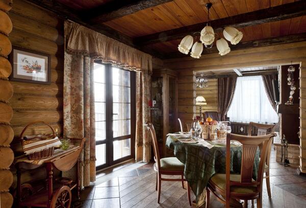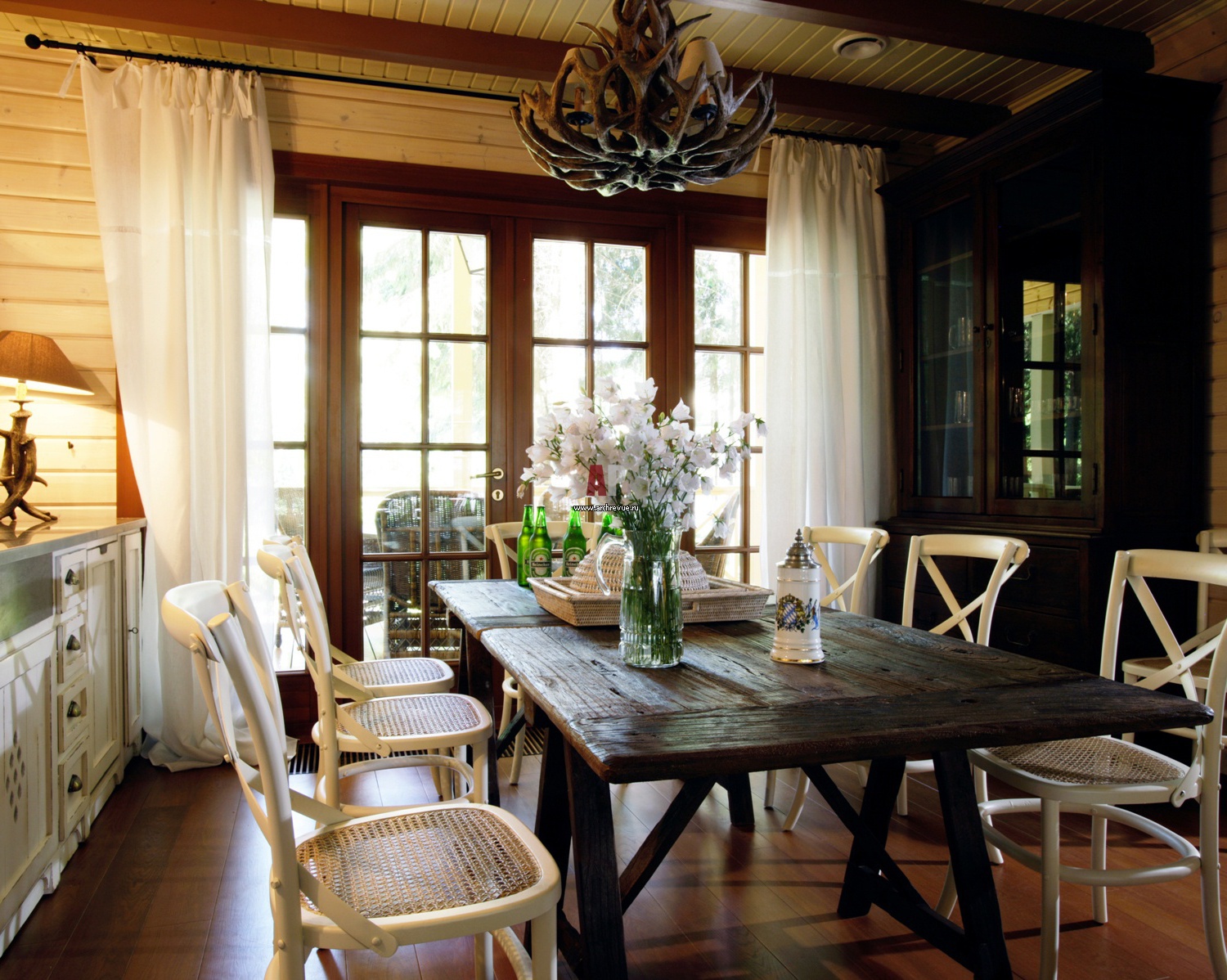 Тоже деревенский стиль, но американский. Пол должен быть облицован камнем, все остальное — деревом. Мебель громоздкая (но можно не лавки, а деревянные стулья). На стол скатерть, нарядные тарелки выставить на полку, на стулья надеть мягкие чехлы в клетку или в горошек. В качестве освещения использовать керосиновую лампу.