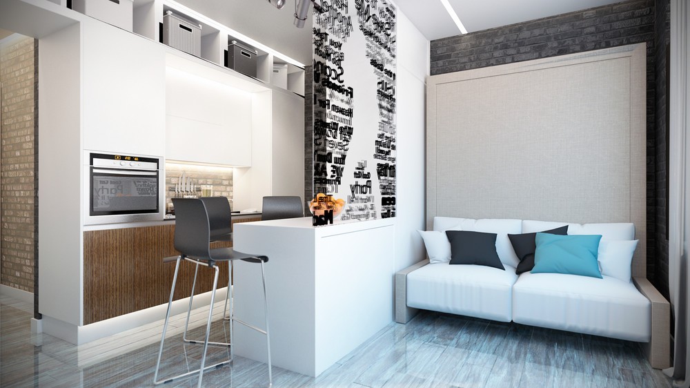 Обеденная зона займет не так много места, если использовать дизайнерскую барную стойку, которая одновременно зонирует студию, или же раскладной стол.