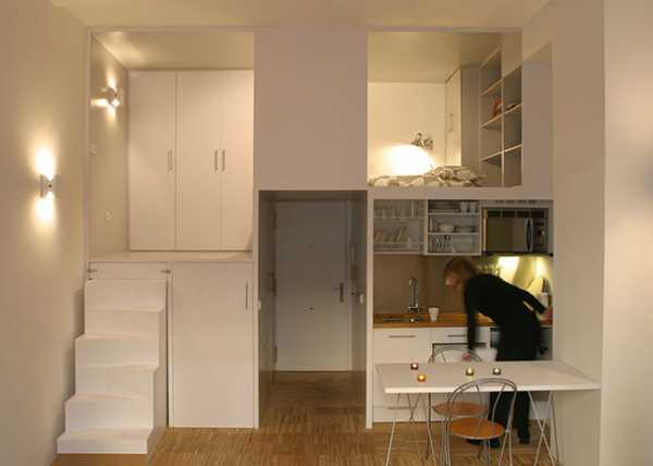 Кухонная мебель расположена под «спальным отсеком» и аккуратно прикрыта складной дверью. В закрытом виде все пространство «мини-лофта» крайне лаконично: простые формы, белый цвет, — классическая современная мебель.