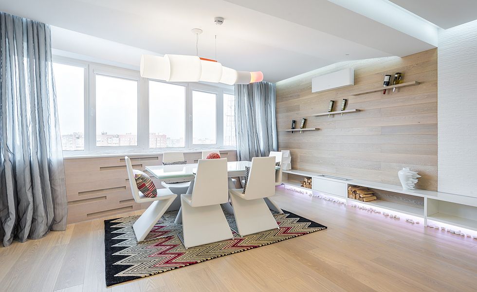 Как видим, в качестве напольного покрытия выбран паркет, выполняющий роль токопроводящей нити по всему полу. Это специальный устойчивый паркет для кухни и гостевой ванной комнаты. Кроме того, как в гостиной, так и в спальне установлены нестандартные шторы. В обеденной зоне они были помещены в штору со встроенным светодиодным освещением.