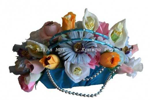 Ну и корзина с 27 бутонами роз. Это когда я их начинала делать, то назвала бутонами роз, а сейчас смотрю, может это все таки тюльпаны??? И все-таки, это была моя первая грандиозная работа, причем даже на заказ. (А «коммерческих» заказов у меня было пока только два от одной и той же подруги, которой на день рождения я подарила корзинку с конфетными орхидейками, сделанными ориентируясь на МК из интернета). На тот момент она мне казалась прямо шедеврально красивой))). Ну ведь я тогда еще не видела работ реальных мастеров, группу вконтакте я нашла попозже — ассоциацию свит-дизайнеров.