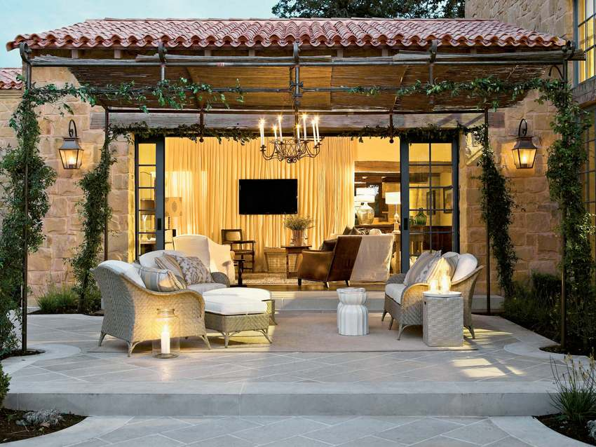 Мебель – еще один важный элемент декора вашей крытой террасы. Выбирайте натуральные волокна, такие как плетение или ротанг, и комбинируйте их с холщовыми ковриками натуральных оттенков. Садовая мебель все чаще заполняет интерьер дома: нередко можно увидеть стулья из волокна и металла за обеденным столом.