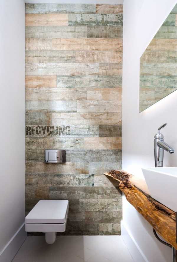 Горизонтальное деление дает еще один эффект: четкая грань как-бы «разваливает» стены в стороны опуская потолок. В узком и высоком помещении это нужный эффект. Если подобный дизайн туалета — с четким делением — вам совсем не нравится, сделайте что-то похожее, видоизменив идею. Например, как на фото ниже.