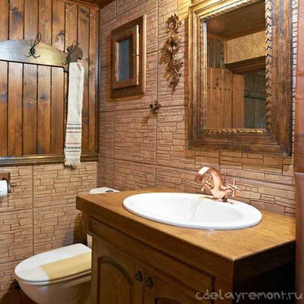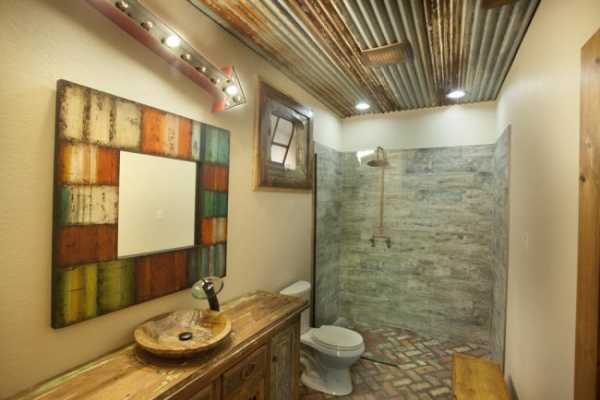 Узкий совмещенный санузел в теплом деревенском стиле