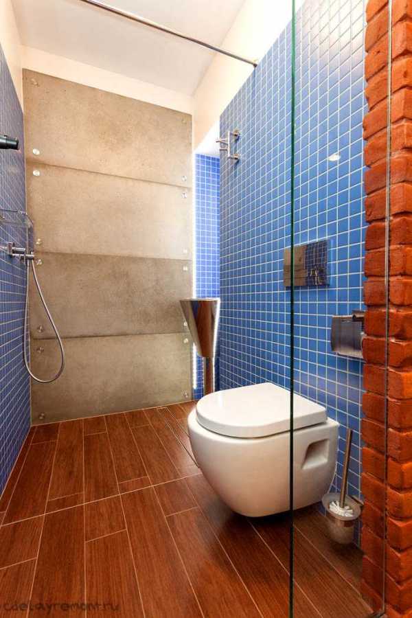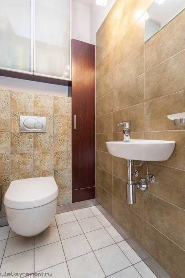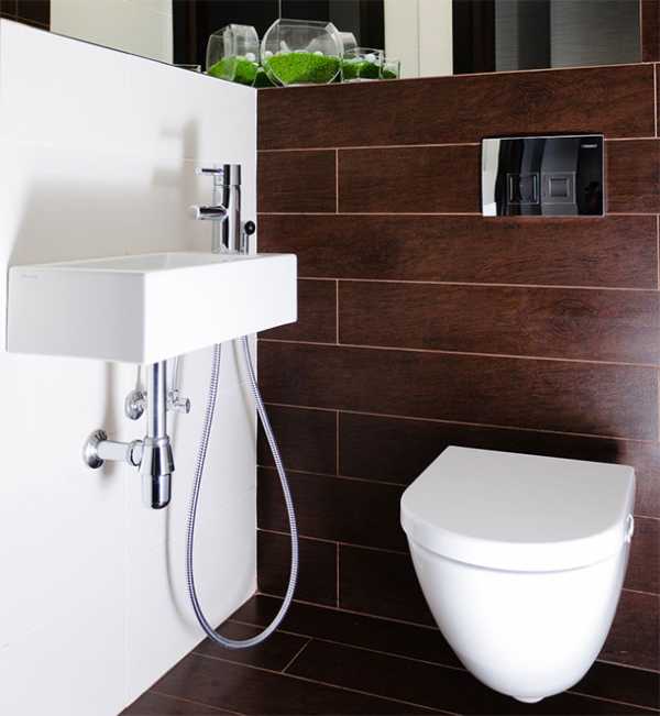При той же планировке можно выбрать другой вариант — поставить унитаз (при желании и возможности и биде) вдоль длинной стены, а мини-раковину расположить в углу.