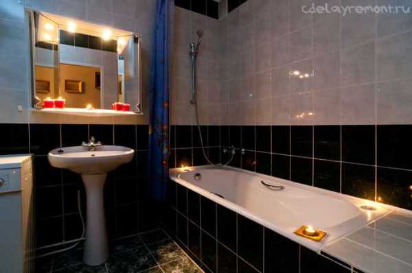 Еще один вариант современной отделки совмещенного санузла. Эффективное зонирование обеспечивается использованием материалов контрастного цвета.