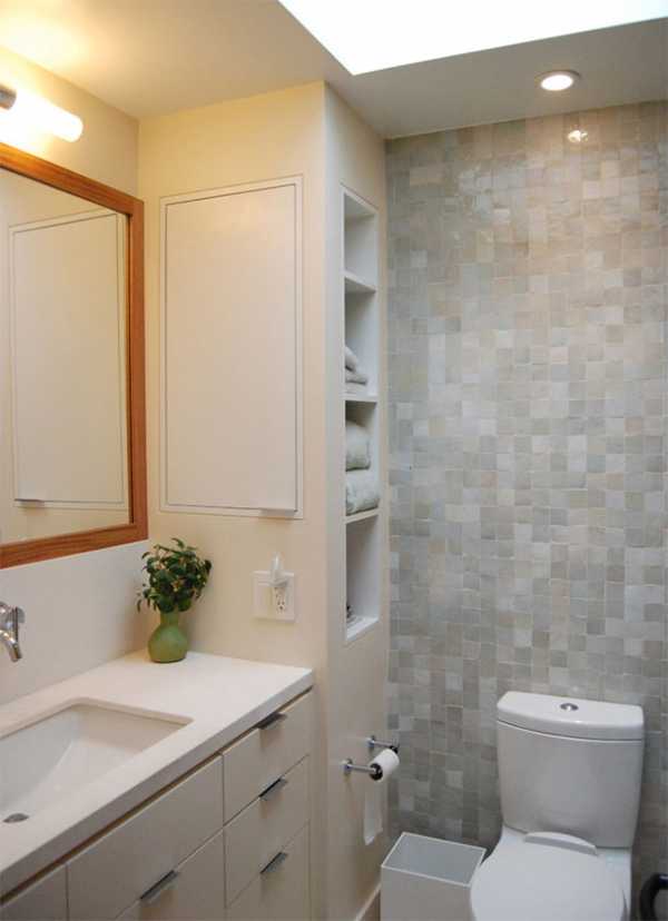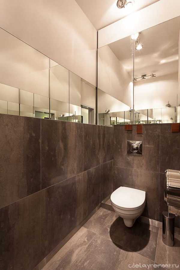 Не забывайте о зеркале: кроме своей прямой функции, оно выполняет еще и функцию расширения пространства. Грамотно размещенная зеркальная поверхность способна творить чудеса и превращать совсем крошечную туалетную комнату в нормальных размеров помещение.