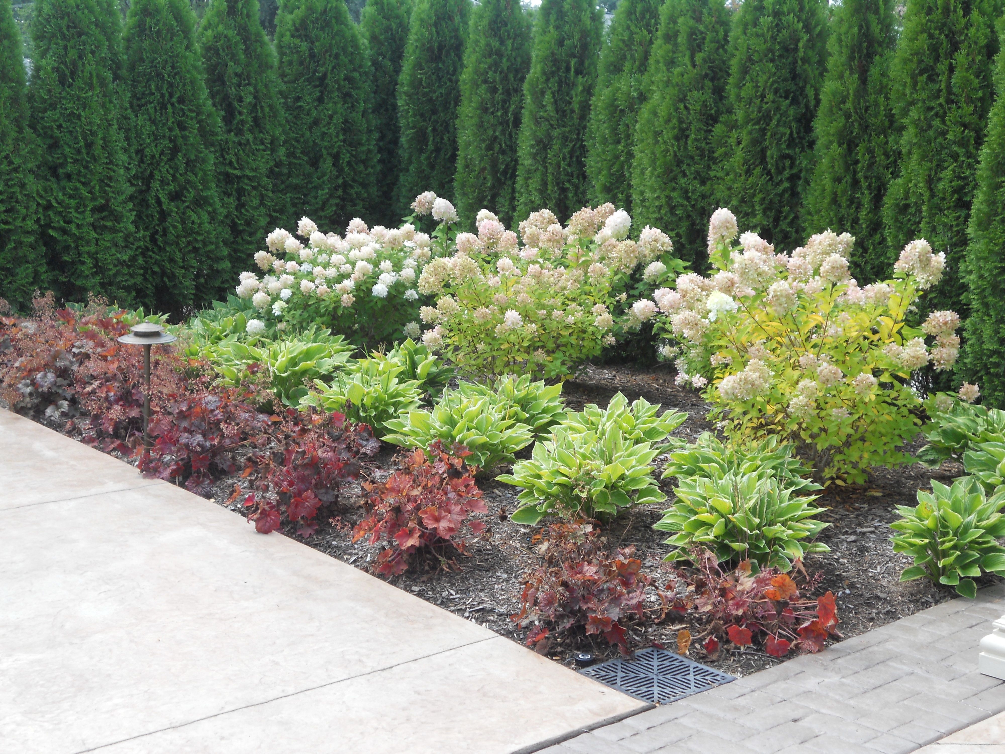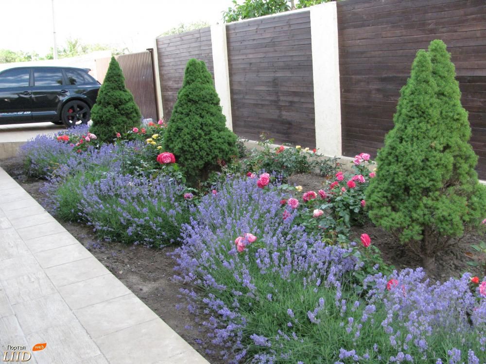 Важно! Основной принцип миксбордера: постепенно уменьшают высоту растений. Не рекомендуется сажать рядом с сильно разнящимися по высоте культурами, а возле цветника — высокие растения, загораживающие обзор. Среди хвойных для создания ландшафтного дизайна лучше использовать карликовые породы, лиственные не должны быть агрессивными.