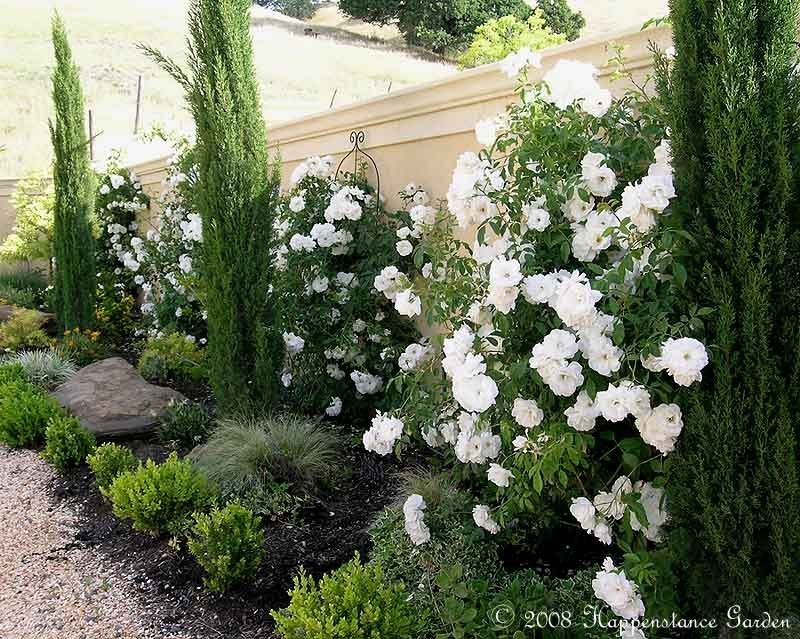 Источник фото — russcletta.com. Автор — ландшафтный дизайнер из Италии Russ Cletta. Розам отведен передний план, хвойники служат фоном.