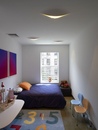 Яркое и контрастное покрытие следует применять в виде узкой полосы, расположенной по центру одной из длинных стен, к которой приставлено изголовье кровати.